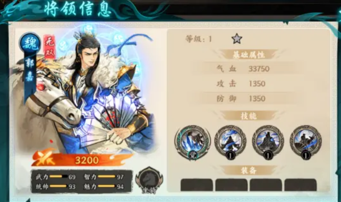 郭嘉有着全体伤害和冰冻控制,他的怒气技“地泉鲸浪”会对敌方的全体主将形成伤害,对附带寒冰效果目标有60%概率造成3秒冰冻,让其无法行动,他的被动能在场上有敌人获得寒冰时,对其形成伤害并施加1.5秒冰冻,解锁觉醒技后怒气技面对没有寒冰的目标,也有50%概率形成冰冻。