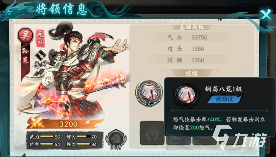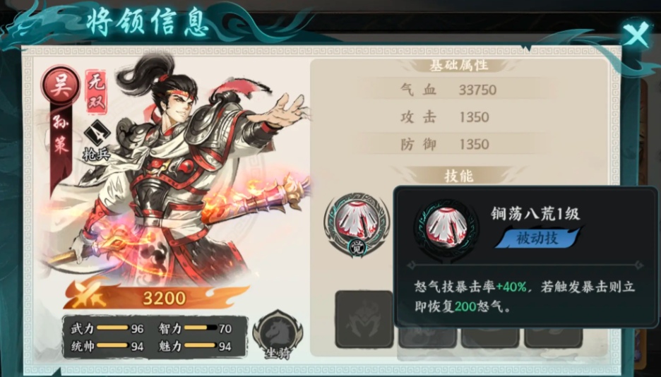 孙策是输出枪兵,他的怒气技会对敌方攻击最高者造成输出,若其身上带有灼烧,会让周围的敌方也受到120%溅射伤害,他的被动会在场上有敌人获得灼烧时,造成一定输出,解锁觉醒技会让怒气技的暴击率加40%,若成功触发暴击还会立刻恢复200怒气,帮助更快打出高额单体伤,轻松秒掉对方的主c。