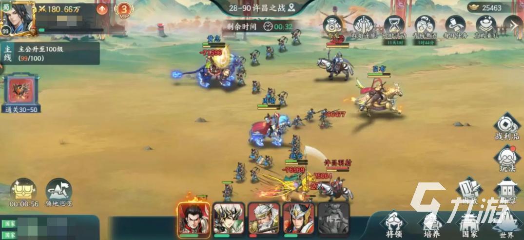 是以强力范围输出为主,辅以控制与辅助武将,迅速击溃敌方前排。周瑜、吕布、黄忠是这一体系的核心武将。周瑜的火焰系AOE覆盖范围极广,持续灼烧能不断削弱敌方小兵与武将血量。吕布的怒气技释放时免控并主动突进,可打乱敌方阵型并在密集地带形成伤害核心。黄忠则以稳定的远程群射和破甲特效承担收割与补刀任务。这三人组可以快速清空敌人的兵,己方小兵在火力压制下得以迅速推进,滚起雪球。