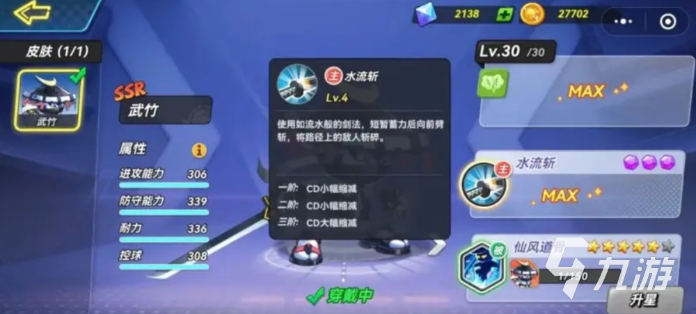 武竹的天赋是在进攻对手两分区后,进行后仰跳投能自动触发后撤闪身,并且提升命中率,在加上数值面板的加成,使得其在两分区的得分率高,并且手段多样,是各类角色中两分得分最强选手,他的主技能会用像是水流一样的剑法,在短暂蓄力后向前劈砍,将路径上的敌人斩倒在地,对方如果手中有球,球也随之掉下,玩家可以趁机夺取对方手中的球并拿下分数;