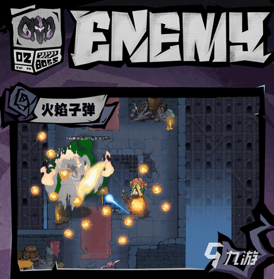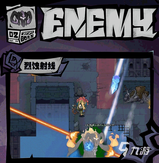 他的主要技能是火焰子弹,每一波发射8个子弹,一共发射6波。大家需要注意拉开距离进行躲避,不然全吃的话,很容易就被秒杀了。他还有个技能叫做烈蚀射线,会在周身生成若干束缓慢旋转的烈蚀射线。这时大家也跟着移动并射击就好,速度并不算太快,稍微注意点就能躲开了。