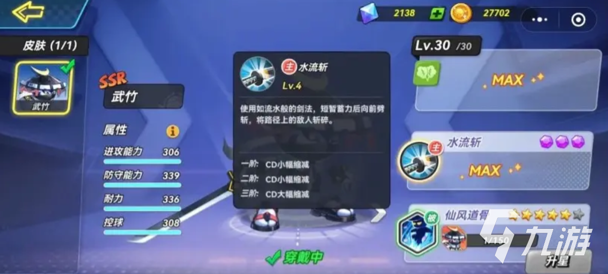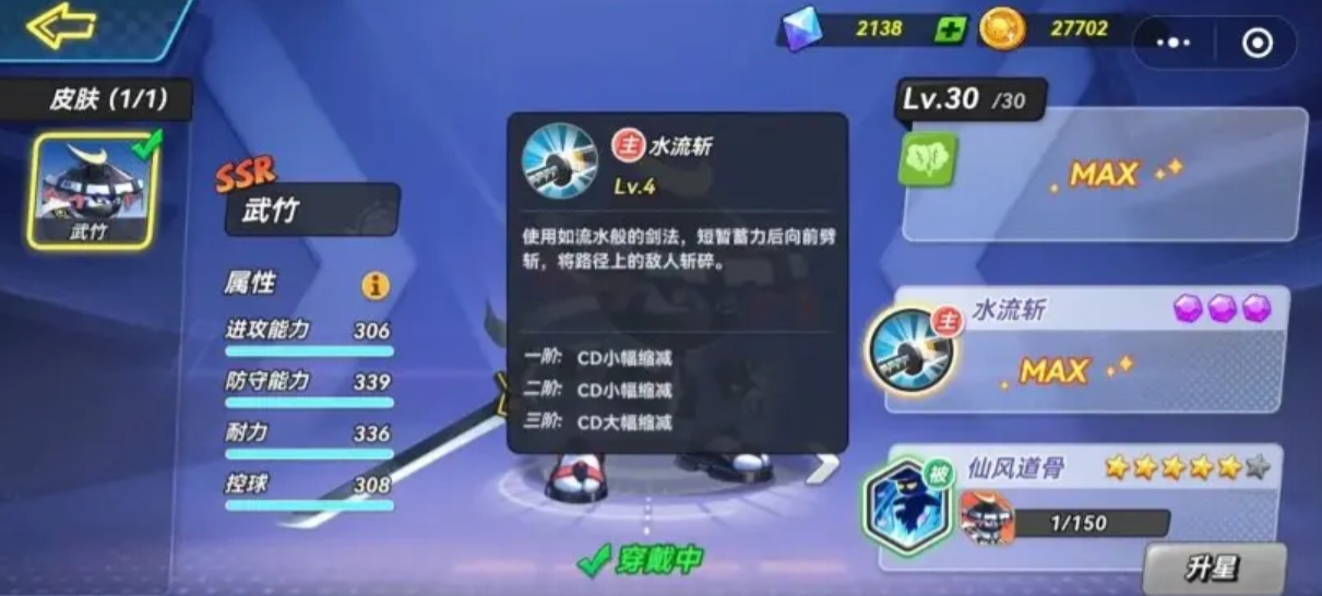 武竹从数值面板上看,两分球进攻能力比较突出,他的天赋能在对手两分区进攻时,触发一段小幅度的后撤转身,并且能提升命中率在进球后回复少量体力,这让其成为两分得分最强的球员,他的“水流斩”会运用高超的剑法,短暂蓄力后将对手给斩倒在地,如果对方此时持皮球,皮球也会随之掉落,从而帮助后续的争抢,他的普攻总共有3段,根其他英雄一样第3段会将敌人给击倒,但他比较特殊的是,第3段会额外附带一个突刺能力,可以靠这个来给予敌人额外伤害。