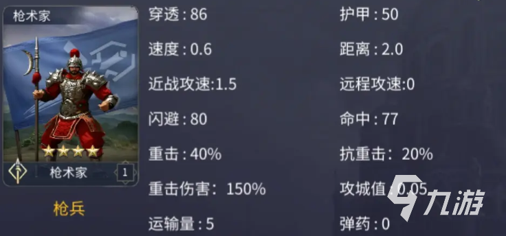 枪术家属于枪兵,他的被动是对骑兵造成的伤害提升20%,针对所有近战攻击的闪避率提升12%,阻挡骑兵冲锋较强可看破隐武者隐身。