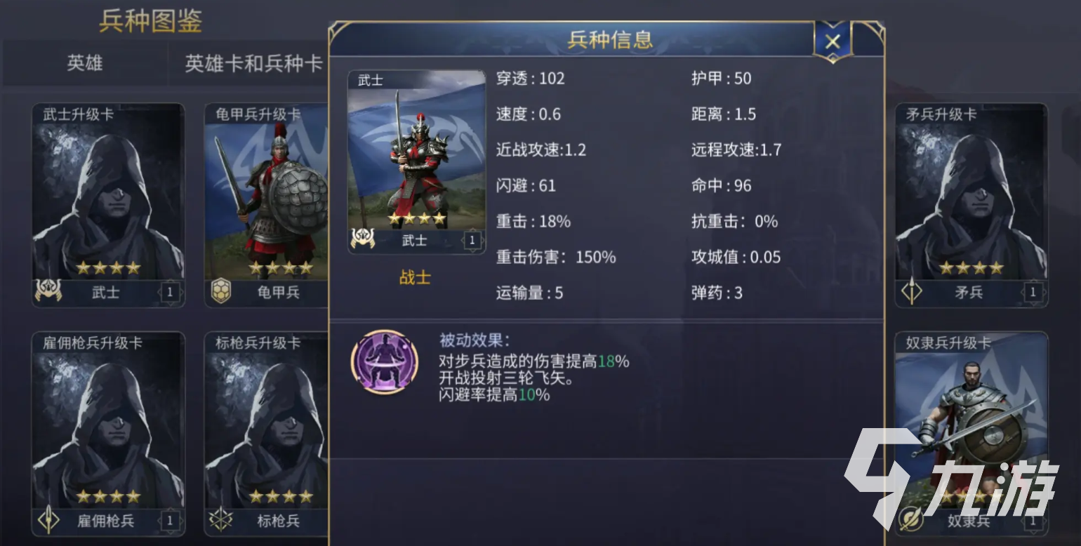 武士是合区前最强战士兵种,他的被动是对步兵造成的伤害提升18%,开战之际会投出三轮飞矢,并且闪避率提升10%。