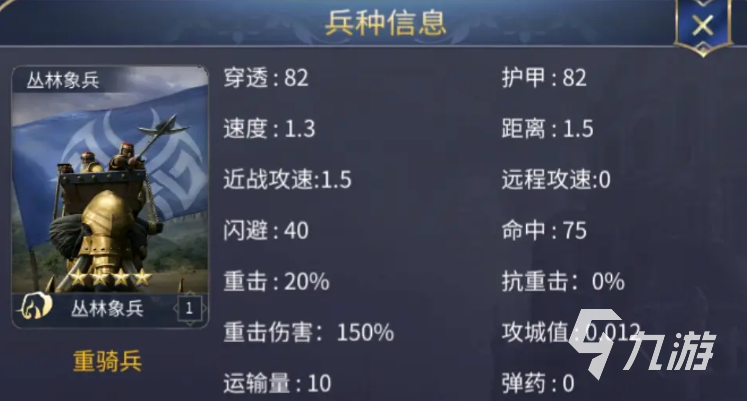 丛林象兵属于最强重骑兵,他的被动是对步兵造成的伤害提升6%,受到的所有伤害减少8%,经常冲锋之际可以穿越目标并形成220%伤害。
