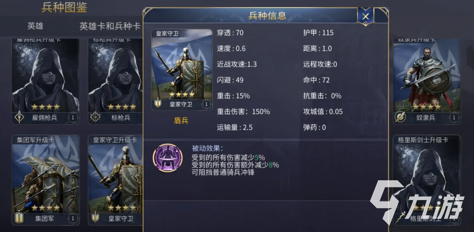 皇家守卫是综合来说最好用的盾兵,他的被动是让受到的伤害减少5%,并额外再减少8%,可以阻挡普通骑兵的冲锋。