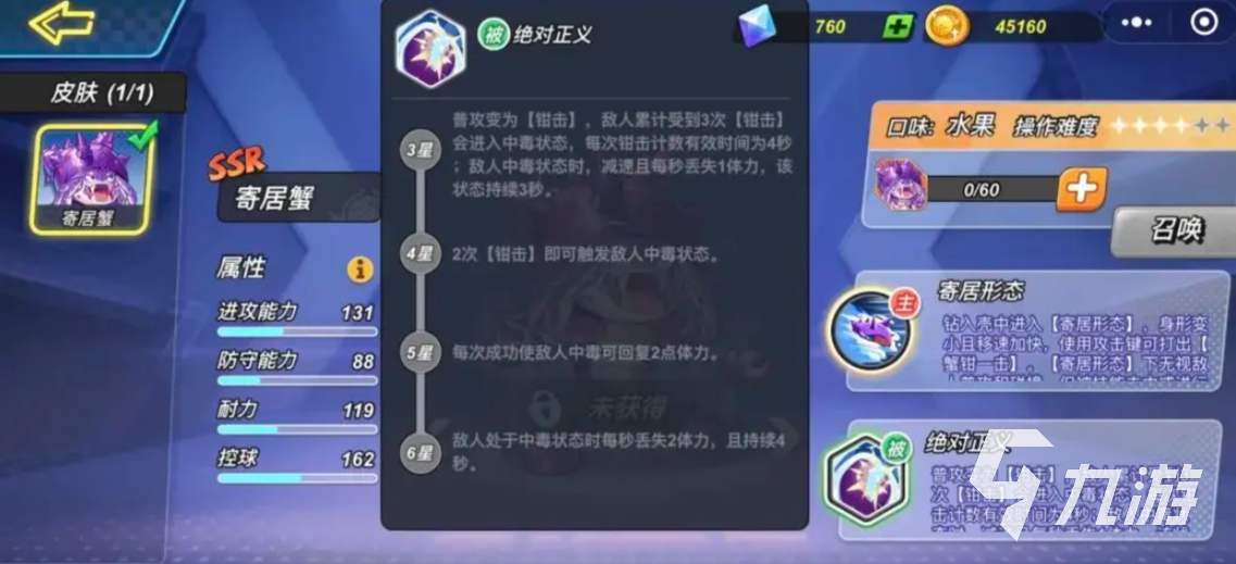 寄居蟹是一个非常灵活的角色,他的主动技简单来说就是会变成一个移速很快,并且敌方任意普攻都打不到的形态,此时点击普攻还可以将上方的敌人给夹碎,他的被动是让普攻变成钳击,钳击只要命中敌人达到3次,就会让目标陷入到中毒状态中,中毒下的敌人会减速并持续丢失血量。