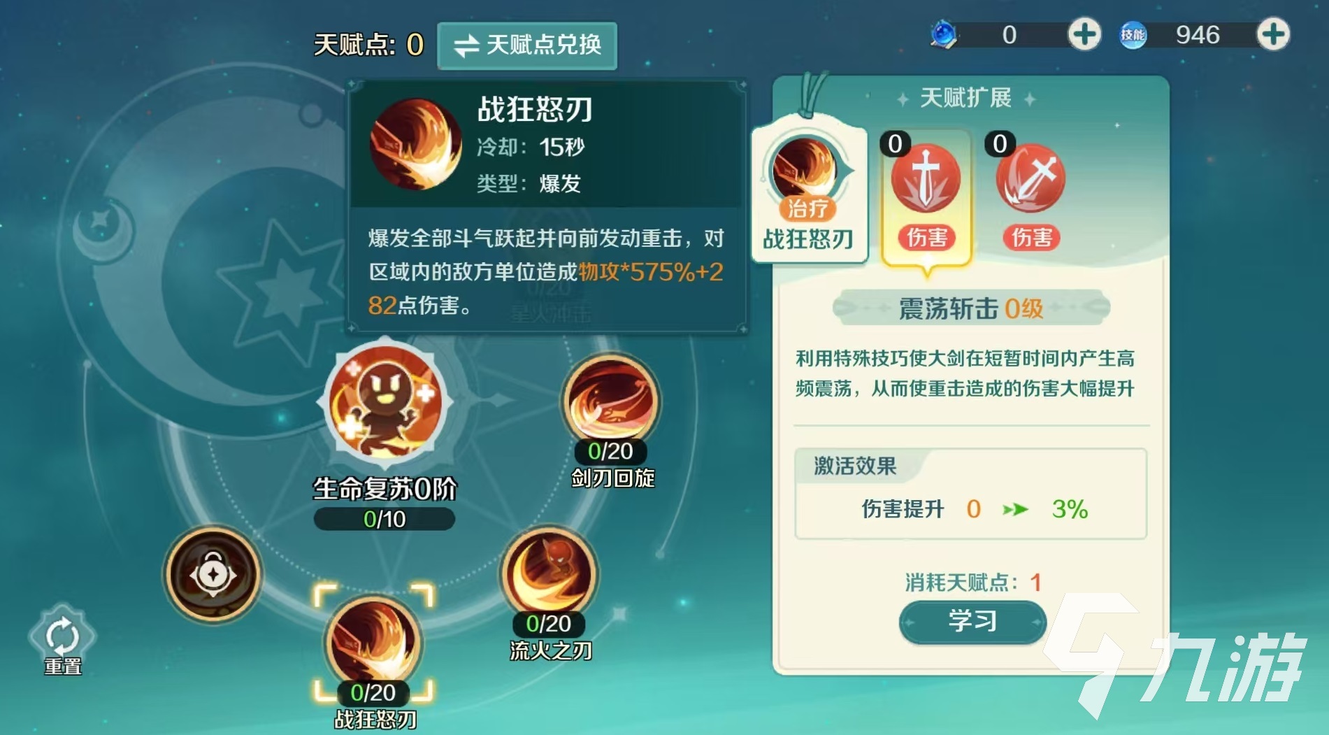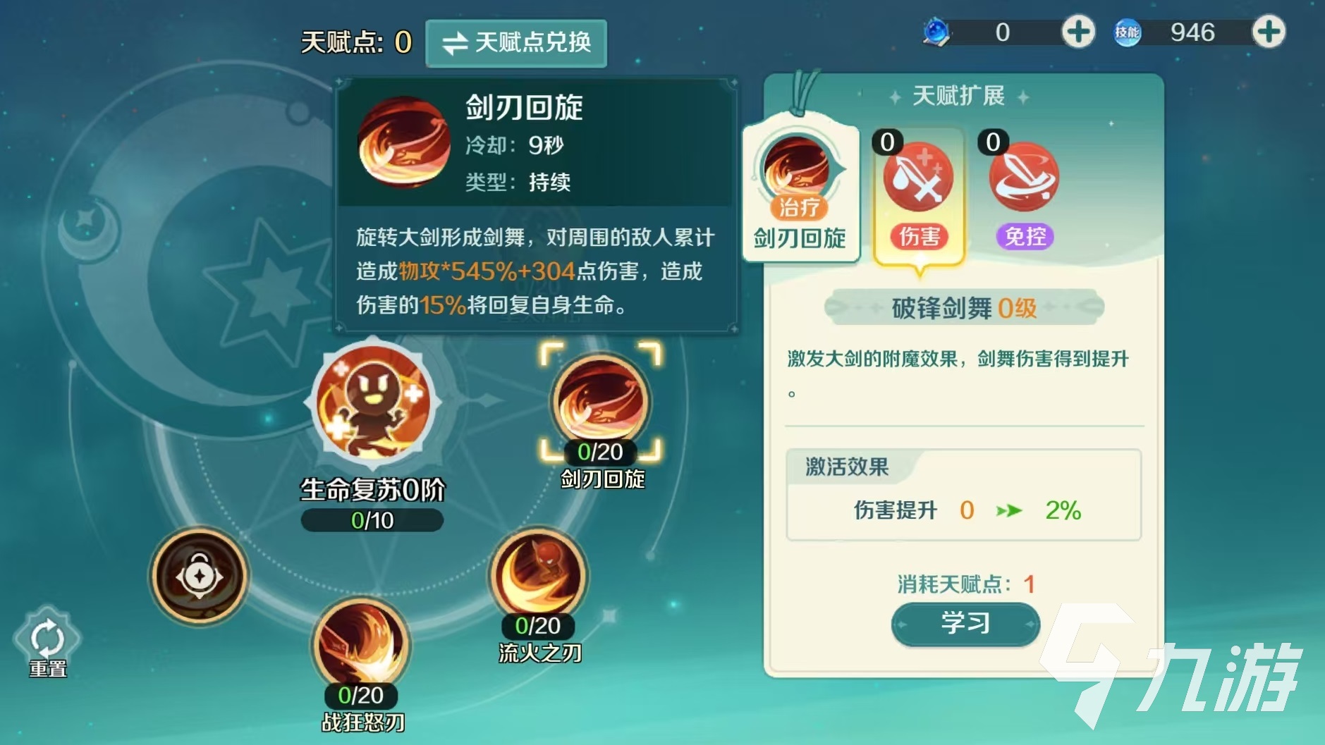狂刃的主要技能包括星火冲击、剑刃回旋、流火之刃、战狂怒刃和盖亚之盾这几个。这些技能中涵盖了近战输出、控制、回复生存和状态提升等各种效果,每个技能还包含有两个不同的天赋扩展。在加点方面,主要分为副本战斗和PVP战斗这两大类。先来看一下应用最多的副本战斗方案,星火冲击技能天赋优先选择星火能量,效果是在释放技能的时候,有几率使得技能冷却时间减少,这样就能在战斗中更多的释放技能了。剑刃回旋是狂刃的主要输出来源,天赋优先选择破锋剑舞,效果是大幅度提升该技能的伤害,清理小怪的时候效率很高。