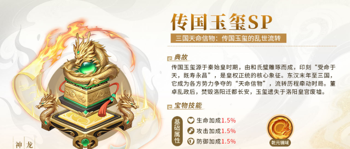 且还会给随机2个己方单位提升10%攻击力,输出能力强,且拥有一定辅助效果。第二个是传国玉玺,这个宝物使用和氏璧雕刻而成,也是皇帝皇权集中的一种象征,在进入三国之后,这个宝物就成了各方势力争夺的对象。