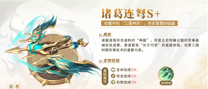 诸葛连弩:这个宝物其实是对诸葛亮在军事方面才能的一种体现,曾经在历史上,它也并不是虚构出来的武器,而是进行过改良的,是战略和科技的结合,也是智慧的结晶,对武将生命,攻击,防御均有加成,使用后可发射“连珠箭雨”,后排敌人遭受200%攻击力伤害;
