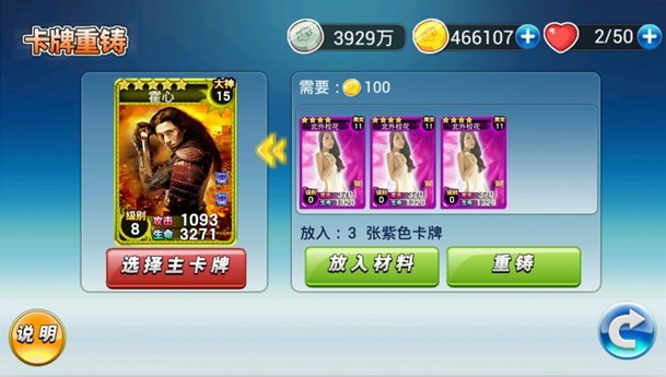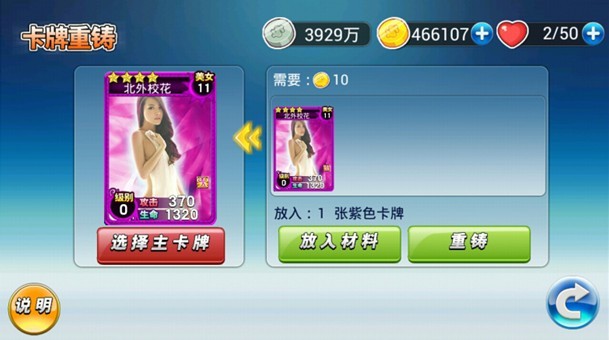 简单来说,就是可以将紫色卡牌作为主卡牌,消耗另外1张紫色卡牌和10金币进行铸造,重铸后生成与主卡牌等级相同的另外1张紫色卡牌(有几率重铸后生成金色卡牌碎片);也可以将金色卡牌作为主卡牌,消耗3张紫色卡牌和100金币进行铸造,重铸后生成与主卡牌等级相同的另外1张金色卡牌(有几率重铸后生成红色卡牌碎片)。