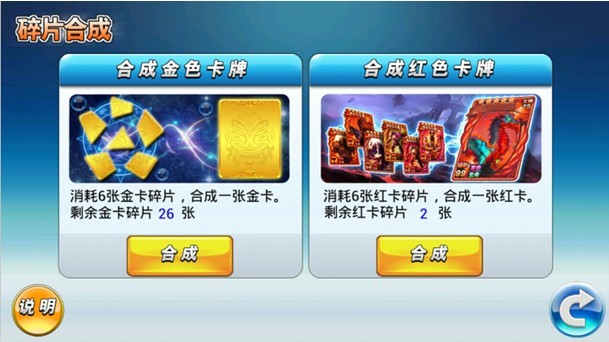 部分礼包、累计签到奖励以及部分活动中会获得金色卡牌碎片,通过碎片合成功能,6张金色卡牌碎片可以合成1张金色卡牌。