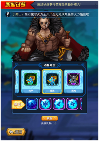 职业试炼分为入门、简单、普通、困难、噩梦、地狱六个难度,每个难度对应着的解锁等级为10、25、40、55、75、105。根据不同难度等级的副本挑战胜利后获得的龙魂也就越多,龙魂则是培养角色品质的必需品,所以每天3次的挑战必不可少哟。另外,当你挑战的难度越高时,还会获得不同职业的徽章,这些徽章是用于不同职业的突破必须品。