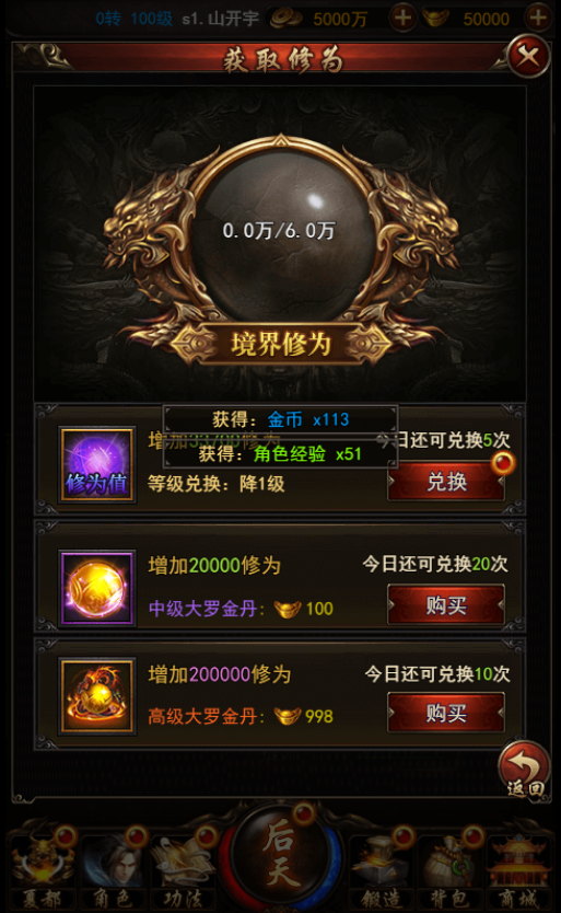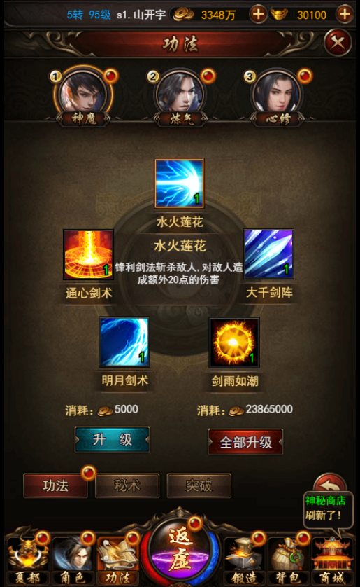 简介:功法也是角色的技能,一个角色拥有5个不同的技能,通过等级解锁,强化。强化功法需要消耗大量的金币。