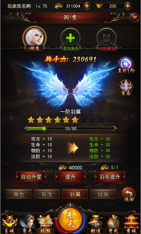 翼星级与进阶提升羽翼品质。3个角色均有各自独立的羽翼,玩家通过消耗金币,羽毛提升羽翼的等级,等级越高属性越强。