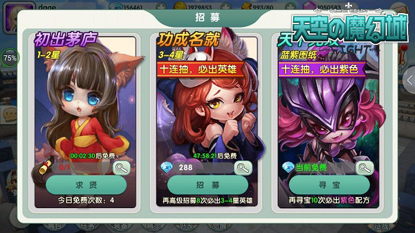 招募:是通过288钻石来抽取英雄的,每位玩家第一次通过钻石抽取是一定会获得一位4星的英雄的。每过一段时间,我们也是会获得免费拜将的机会。