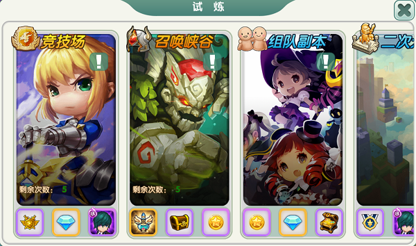 试练里面分为竞技场,召唤峡谷,二次元界等有趣的副本活动。