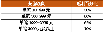 活动内容:活动期间内,单笔充值金额将对应以下返利规则进行返利。