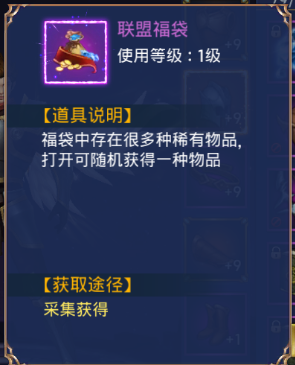 白银宝箱则常常开出绑钻,数量不多,毕竟打个boss都有数百绑钻了,不过如果运气大爆发,也能开出数量不俗的绑钻的。黄金宝箱就专一多了,只能开出联盟福袋一种道具,听到福袋大家应该就懂了,完全就是抽奖,福袋中存在很多种稀有物品,打开可随机获得一种物品,这物品究竟是鸡肋的金币,还是橙色装备,又或者是钻石道具,都不得而知。