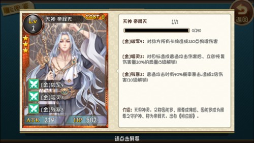 R玩家可以各种AOE无压力碾压,非R可能会被卡很久。这时候有5级以下的人皇是非常大的优势。如果没有,那就帝释天雷阵子吧,有多少上多少。强化等级推荐3级以上。4级的话把握更大。如果愿意充一点小钱的玩家充50出一张金仙多宝会好过很多。况且多宝在5图以后也必不可少。如果你T给力奶给力,可以考虑双T,双DPS双奶慢慢磨。这里也给大家展示一下卡牌。