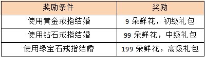 活动内容:在活动时间内结婚的玩家均可领取奖励1份,玩家达到35级才能结婚哦!