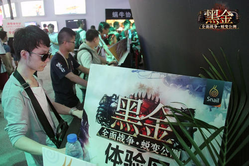 九游报道,在本届ChinaJoy展会上,蜗牛公司别具一格的“蜗牛状”展馆内,旗下产品分别设有高级体验区。端游产品《黑金》等提供数十台高配机试玩,《太极熊猫》等多款手游提供IPAD试玩,现场人头攒动,十分火爆。