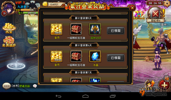 1、累计登陆签到,每三天大约可以获取300水晶,和商店道具,宝石盒。