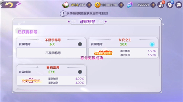 目前共开放了四种称号奖励,其中称号“长安之主”对应了全新开放的竞速模式玩法,在每周六日开放的激战中进入排行榜前五,即可解锁该项强力称号,可为角色带来暴击概率与暴击抵抗提升1.5%的加成,并可持续7天哟!来为你的缘神们提供更加凌厉的攻势吧!