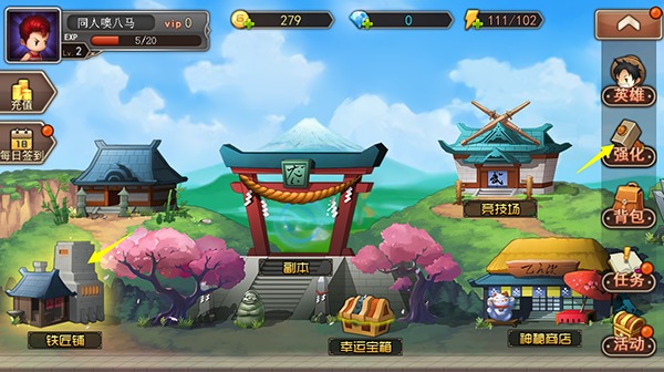 菜单中的强化按钮和场景中的铁匠铺建筑都可以进入铁匠铺。