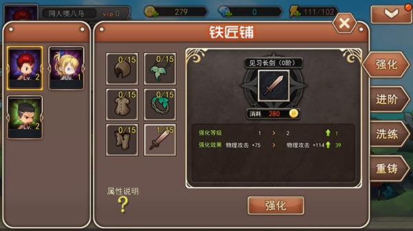 最基本的强化装备功能占据着首页。这里只需要有金币,就能提升装备的强化等级。