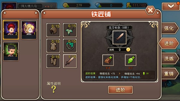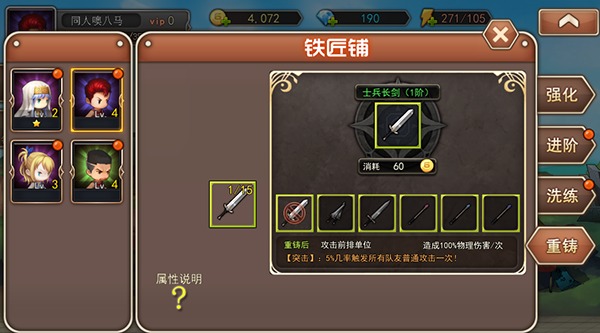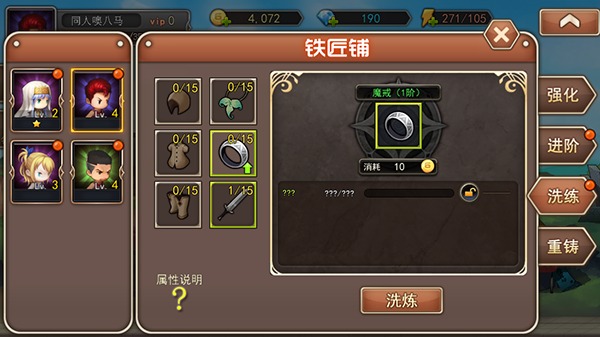 强化、进阶、洗练都是在游戏中的铁匠铺进行。