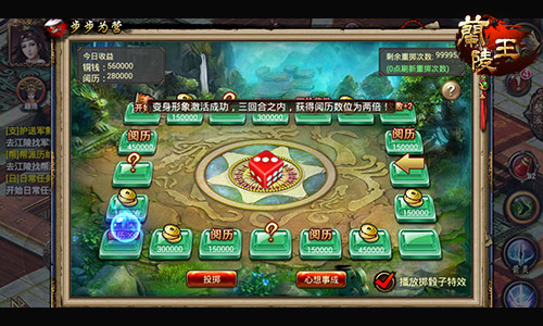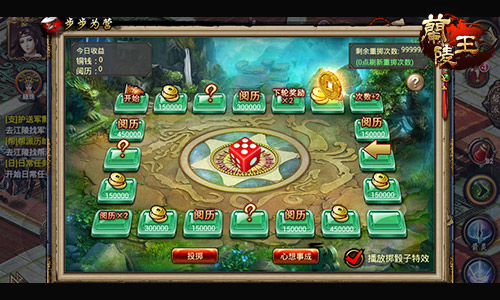 步步为营玩法,玩家每天有十次免费投掷骰子的投掷次数,0 点重置次数;玩家投掷点数后,可使用【心想事成】花费30元宝来选择想改变的点数;玩家根据投掷的骰子点数前进时,在格子里会触发相应的随机事件或获得奖励,奖励包括大量的铜钱与阅历。
