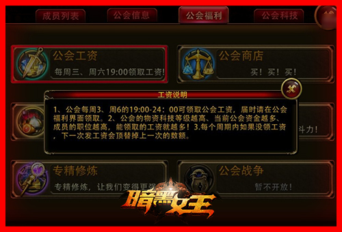 公会工资是公会系统的一个超级福利,每周三、周六都可以领取一次工资,获得海量金币!然而,个人所能领取的工资数量和你在公会中的职务直接挂钩。会长最多,然后按照职位副会长、官员、精英、会员依次递减,所以呢,最优选择是自己创建个公会然后搞得风风火火,财源自然滚滚而来!