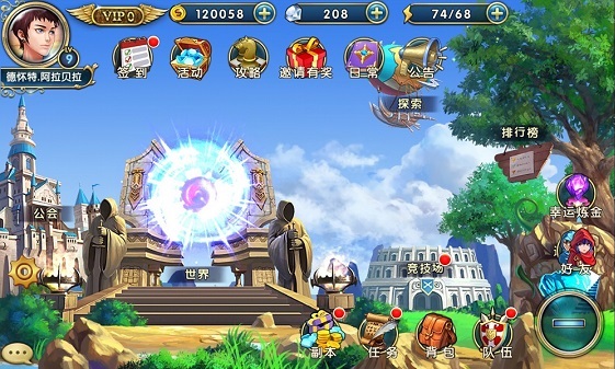 除了上述的功能键外,大多数游戏场景都是为独立建筑标志,如竞技场,公会,世界地图,遗迹等各个功能,触屏即可进入。