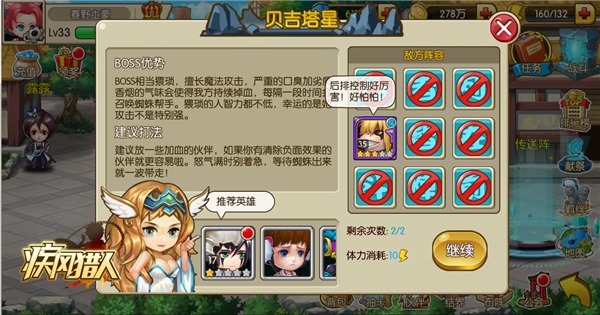 《疾风猎人》贝吉塔星挑战中BOSS擅长魔法攻击,严重的口臭会使我方小伙伴持续掉血,每隔一段时间还会召唤蜘蛛帮手。所以建议大家带一些加血的小伙伴,如果有能够清除负面效果的小伙伴,那就会更容易了。在贝吉塔星挑战中,只要坚持的时间越久,得到的宝箱就越多,是男人就坚持100秒吧!