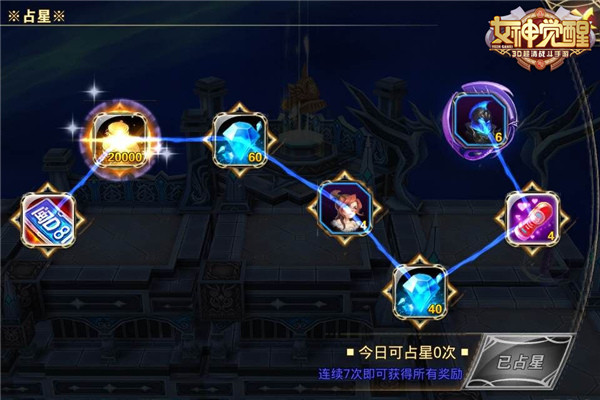 点击“领取”按钮就可以进行每日一次的“占星”啦!每天只能够进行一次占星,7天为一个轮回。占星界面由北斗七星构成,每签到1次,则随机领取1个奖励,领取了某个奖励后,该奖品对应北斗七星位置上的奖励图标消失。7次签到后,意味着奖励全部领取了,此时北斗七星七个位置上的奖励图标又会再刷新7个奖励出来。不花费任何成本,日日可以领!