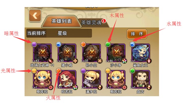 从元素属性上来分,英雄的元素属性分为火、木、水、暗、光五种元素属性。而相对应的,亲们在关卡战斗时也会碰到五种元素的怪物。因此,如何使用元素属性相克成为了快速、巧妙地过关的关键。