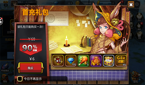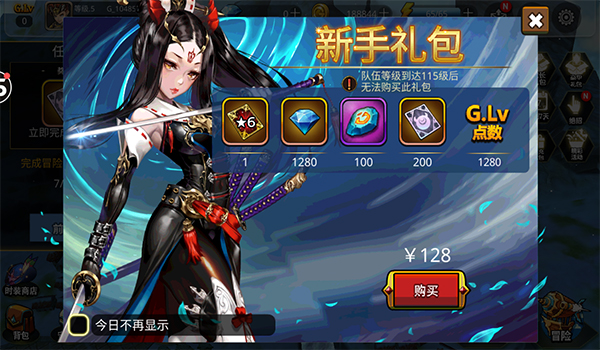 新手礼包 128(RMB) 6星卡*1 1280钻石 洗练石*100 扫荡券*200