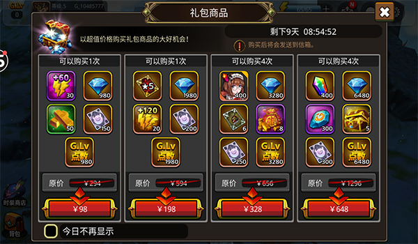 豪华礼包 30(RMB) 60体力*10 洗练石*50 扫荡券*50 4星英雄卡*1