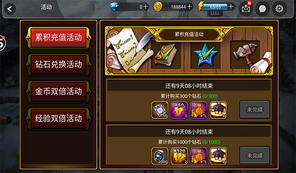 累计充值300RMB:扫荡券*100 灵魂币*3000 100000金币*10 鱼子酱*15