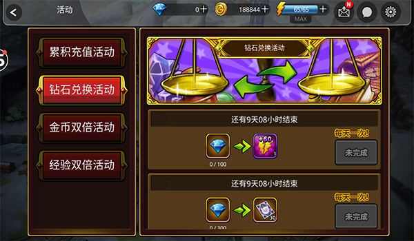 在开测活动期间,玩家还可以用各具数量的钻石兑换体力,扫荡券,洗练石等资源。