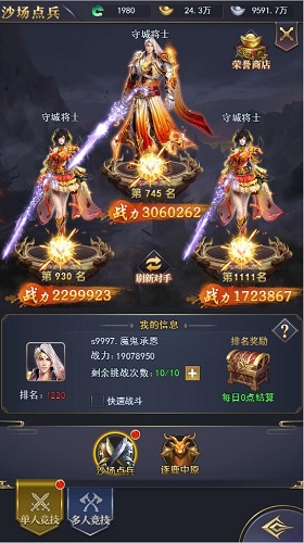 单人竞技玩法,每天有10次免费挑战次数,提高SVIP等级可以额外购买挑战次数。玩家和系统匹配的3名玩家中的1名对战,提升排名可以获得排名奖励。此外,玩家每日可以录取排名奖励,排名越高奖励越多。