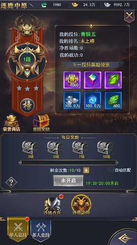 单人竞技玩法,每天19 : 30-20 : 00开启,有10次免费挑战次数,可额外购买挑战次数。逐鹿中原共包括看铜、白银、黄金、钻石 4 个段位,在匹配中击败其他玩家可陀得1个星级,星级满时可以提升当前段位。