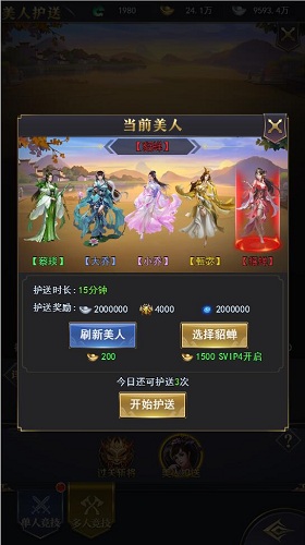 玩家护送的美人随机选定,可花费元宝刷新(有一定概率成功/失败),开通SVIP4还可直接选定最高品质的美人。此外,玩家可点击别人的美人进行拦截,每天可拦截4次,拦截成功可获得奖励。同一目标被拦截2次后将不可再被拦截。