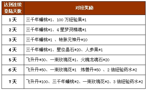 活动说明:1、玩家必须一直保持连续登陆才能获得后续天数奖励。若有一天中断登陆,则无法获得所有后续奖励,请玩家悉知。2、奖励在登录时系统通过邮件自动发放。3、以上奖励内容均为绑定。