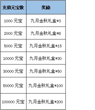 1、【九月金秋礼盒】中包含:听风月刃时装(永久),红色普通饰品兑换卷,第五期名人堂卡包,仙灵女巫·璐璐精魂,幻龙御驾坐骑幻化卡(永久),人参果,四级灵源石,五级灵源石,六级灵源石,七级灵源石,3级太阳石,3级月亮石,高级坐骑进阶丹*70,4星梦灵精魂,梦灵升星丹*70,星位晶石*100,高级星位晶石*30,七星石*10,商城打折卡,坐骑进阶丹*100,经文残页*100,飞升丹*80,秘籍残卷*10,重铸灵符*10,星位晶石*100,将魂*50,无极金丹*10,七星石*10,封宝碎片*5,神马鞭*100,炼兽丹*100,梦灵继承丹*50,红色饰品进化石*10,橙色饰品进化石*20,火魄龙魂石*30,不死鸟羽毛*8,三千年蟠桃*3.五彩精华*20.额外仓库使用权证书*1,滋元育胎丸*5,镇元协脉谱*1,镇元协脉谱·双修*1,青莲秘典·注释全篇*1,青莲秘典·注释绝章*1,赤霞秘典·注释全篇*2,赤霞秘典·注释绝章*2,百年济世露*3,千年济世露*2,万年济世露*1,元仙草*3,易性蛊*5,忘生蛊*5,洗伐内丹*2,秘典·洗髓录*3,幻界生死石*1,乾坤系谱*2,天运元神丸*10,转脉元神丹*5,显影册*5,灵犀丸*1打开必获得其中一项奖励!温馨提示: