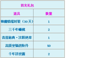 活动内容:为了感谢广大玩家一直以来对我们的关爱和支持,活动期间内首次充值任意元宝的玩家都可以获得“首充礼包”×1,让您再爱一次。该礼包和原本的首次充值礼包不冲突。