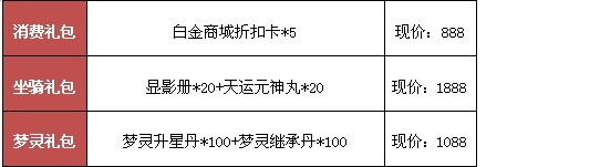 坐骑进阶丹*300、高级坐骑进阶丹*300、玲珑宝盒*20、4星梦灵精魂*3、5级灵石袋*1、六千年蟠桃*5