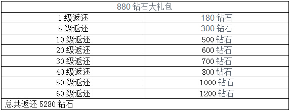 【活动内容】活动期间,玩家可在商店里面花费极低的价格购买一次钻石大礼包,根据等级返还大量钻石;