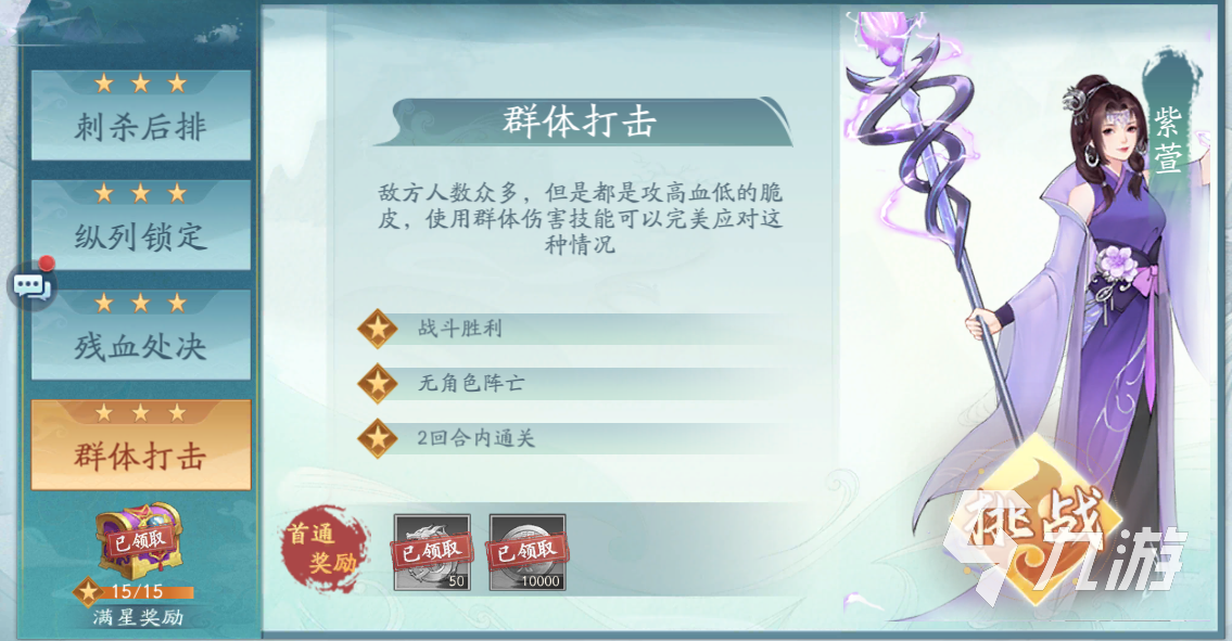 本次的试炼玩法也是有星级要求的, 分别是没有角色阵亡,获得战斗胜利,同时在两个回合内通关,这三个要求达成之后才是三星通过。本次面对的敌人数量是比较多的,在属性上都是攻击高血量低的, 所以说要利用群体的技能来通过才行。